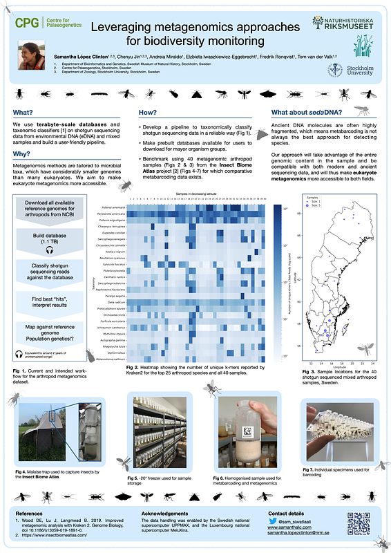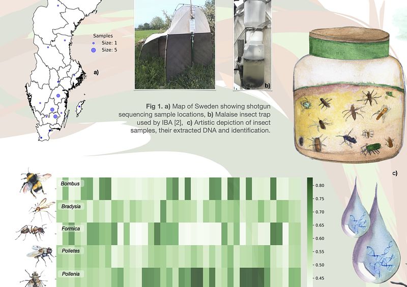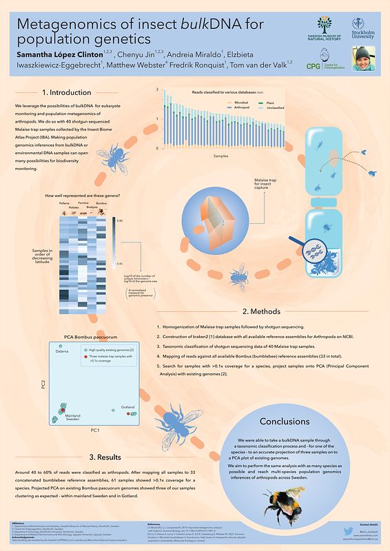 Yo colaboro muy cercanamente con el Insect Biome Atlas project (IBA), el cual en el 2019, lideró el proyecto de ciencia ciudadana más grande de Suecia. Durante un año colectaron muestras de trampas de insectos en todo el país. Nuestros colaboradores de IBA procesaron los datos "metabarcoding" de estas muestras mientras yo trabajé en la porción metagenómica de algunas de ellas. Nuestro primer manuscrito, que compara los resultados de metabarcoding y metagenómica y explora las posibilidades de los datos para realizar genómica de poblaciones, está disponible en esta liga.