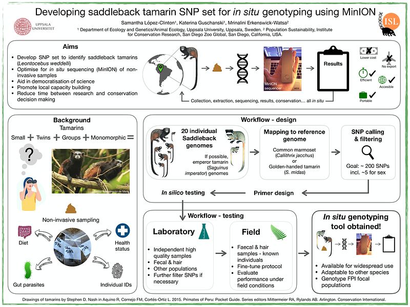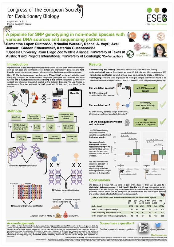 - To develop an in situ genotyping tool using SNPs to individually identify, detect species and sex saddleback and emperor tamarins using non-invasive samples and the MinION portable sequencer (ONT).