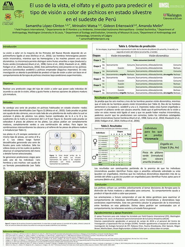 En colaboración con la Dra. Mrinalini Watsa, la Dra. Amanda Melin, el Dr. Gideon Erkenswick y la maestra Rebeca Chen, usamos datos de comportamiento y muestras genéticas colectadas por FPI para determinar cómo es que el polimorfismo en la visión a color de los pichicos emperador y común afecta sus estrategias de forrajeo.